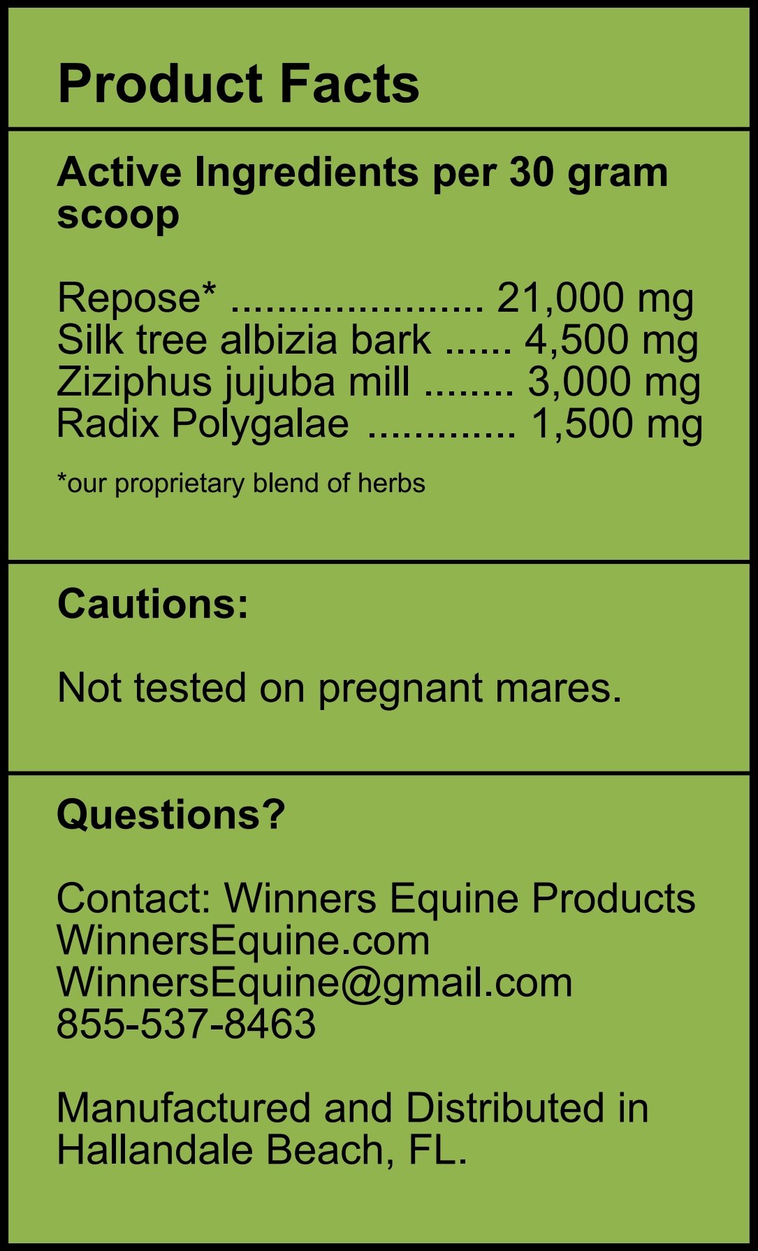 Directions: Mix one scoop of X-Treme Calm Response daily in feed for 21 days.  You may add honey to the feed and herb mixture if desired. Then discontinue use for at least one month. If unwanted behavior reoccours after one month, administer 21-day protocol again.  Do not exceed more than one 21 day protocol every two months.